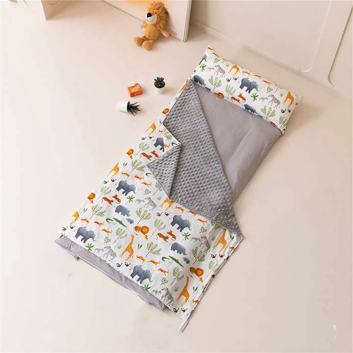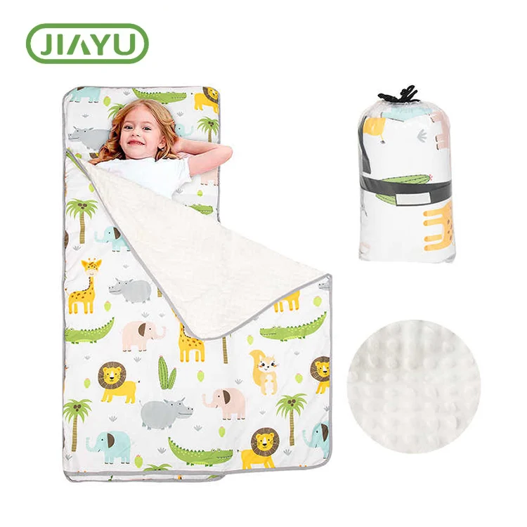 Blue Toddler Camping siest Sac La conception de rouleaux permet au tapis de voyager facilement ainsi que les sangles de fermeture de fixation pratiques et la poignée de transport.