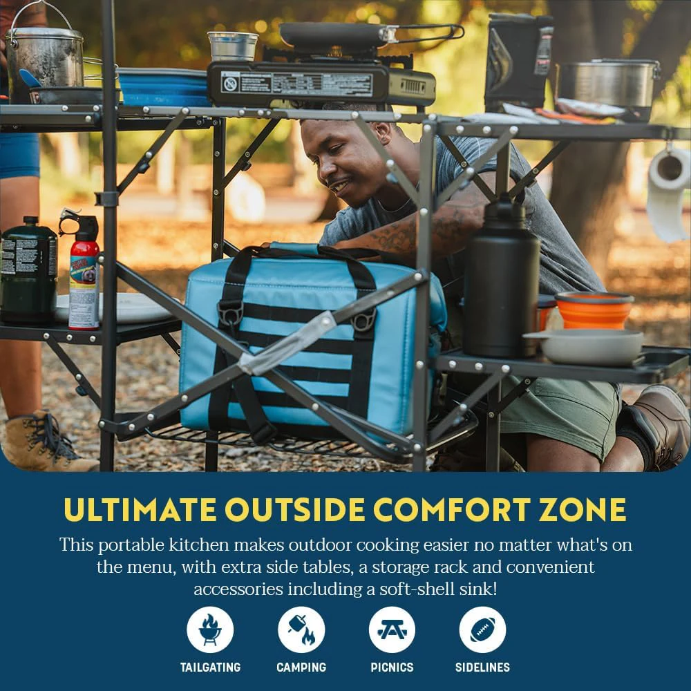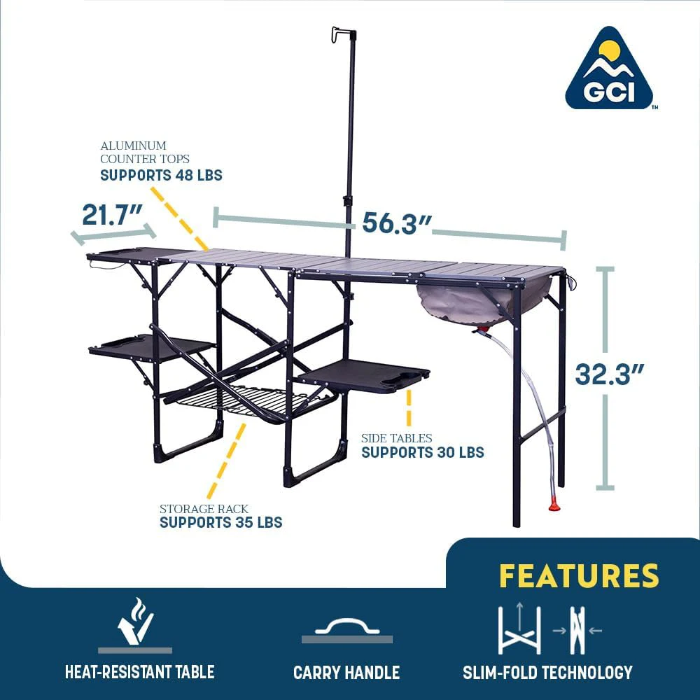 Table de camping en aluminium pliable portable, rendez vos voyages de camp épiques avec la station de cuisine maître de GCI en plein air. Cette cuisine portable est remplie de fonctionnalités (y compris un évier à coque souple!), En faisant l'addition idéale à vos éléments essentiels de talonnage ou de camping.