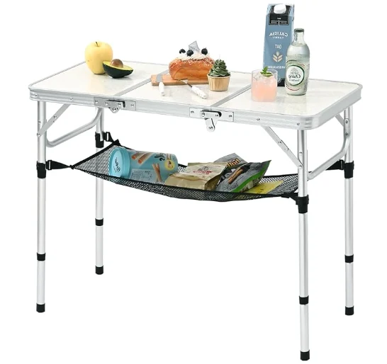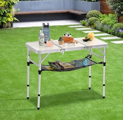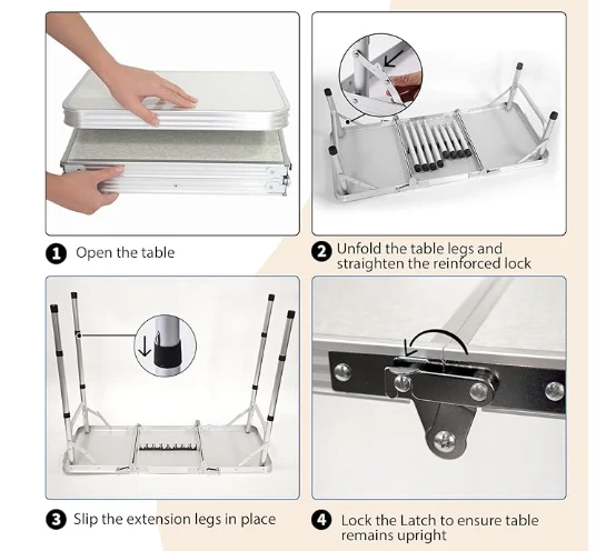 Table de camping en aluminium portable, léger et portable: il est livré avec une poignée de transport pour un transport facile. Il peut être plié dans une taille de mallette compacte pour un stockage pratique dans votre voiture. Avec le poids de 7 lb lui-même, cette table portable peut contenir jusqu'à 80 lbs