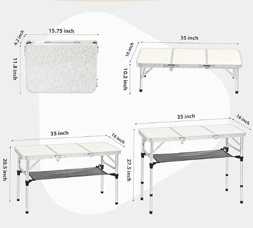 Hauteurs réglables: la table pliable légère comprend 3 hauteurs réglables avec 10,2 pouces, 20,5 pouces et 27,5 pouces. Vous pouvez profiter de votre repas sur la pelouse à la hauteur la plus basse, tout en vous asseyant confortablement avec une chaise à la hauteur la plus élevée
