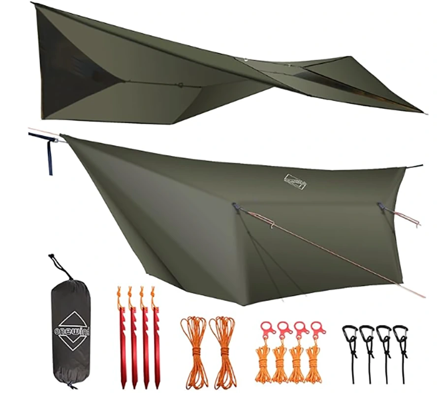 Hamac de camping portable et étanche, bâche de hamac de 3,7 m, bâche ultralégère en nylon argenté, bâche de tente de camping légère et étanche avec portes, facile à installer avec sac de rangement, piquets de tente, vert OD