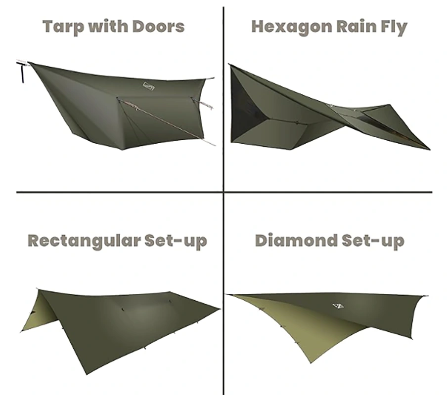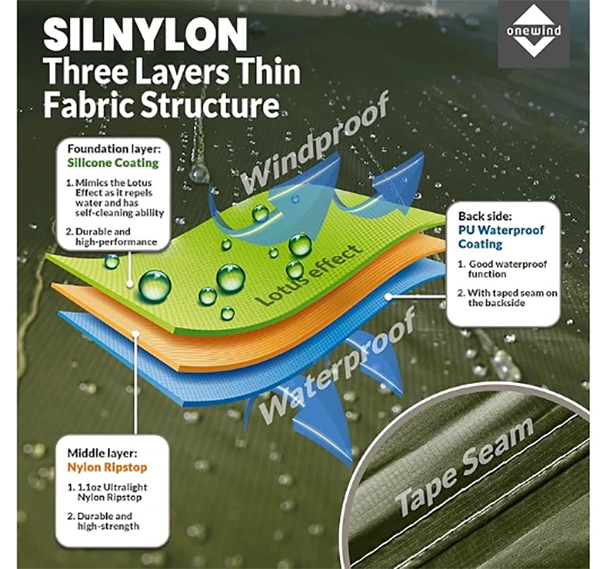 Le hamac de camping portable et étanche offre une excellente protection contre les éléments : pluie, soleil, rayons UV et vent. Il est fabriqué à partir de nylon silnylon ripstop 20D de 1,1 oz traité avec du silicium/PU 4000 mm, ce qui rend le matériau résistant à l'eau.