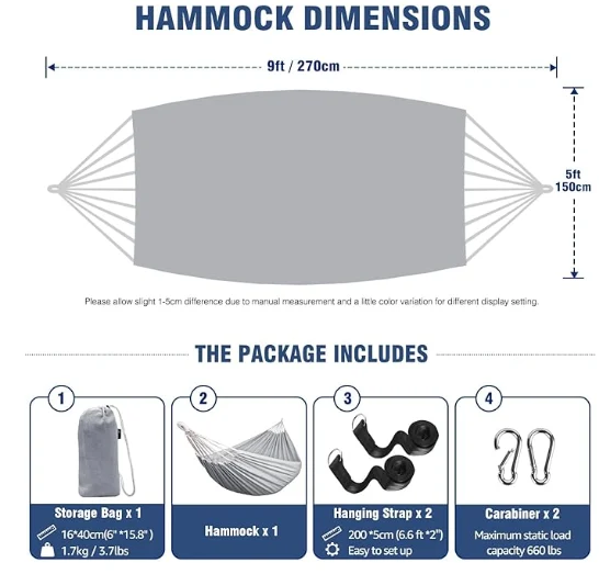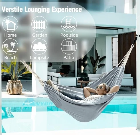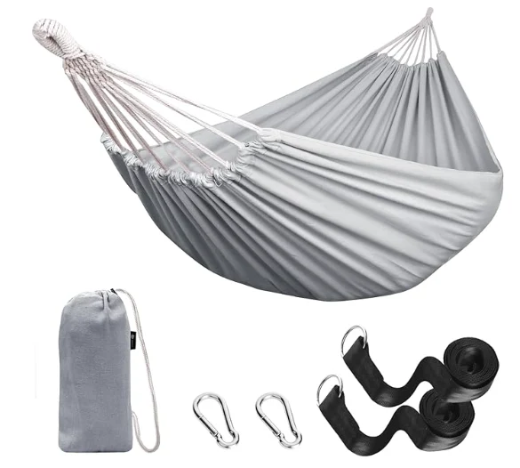 Hamac en tissu extérieur à personne est conforme à la forme de votre corps pour réduire les points de pression et fournir une relaxation maximale. Le coton couleur est résistant à l'usure et est conçu pour résister à une utilisation extérieure et il a une capacité de poids allant jusqu'à 660 livres.
