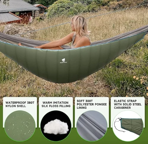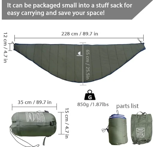 Hamac sur le camping, combiner le confort d'un sac de couchage et l'isolation d'un hamac, facilitez l'adaptation de n'importe quel hamac de taille standard, vous gardant au chaud par temps froid .zhejiang jiayu Outdoor Products Co., Ltd. Il est parfait pour le camping, le randonnée, la chasse, les activités de plein air, l'alpinisme